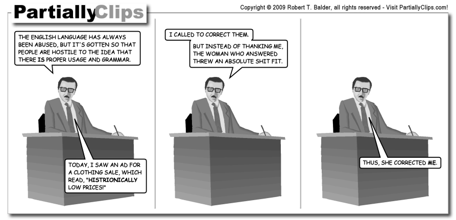 I never miss reading PartiallyClips, and enjoy it enormously. And yet I hang back from pointing people to this strip. Do grammarians such as me (sorry, grammarians such as I) really have to live with this image (cold-looking tie-wearing dude at desk with Hitler mustache and photochromic specs) forever? I guess it’s true that I do own a pair of photochromic eyeglasses and several ties, but let’s try not to reduce everything to cultural stereotypes here. We grammarians are not the party-pooping, nitpicking, thin-lipped, stern-gazed, disapproving syntactic Nazis of myth and legend. We are fun and sexy guys. Really we are.