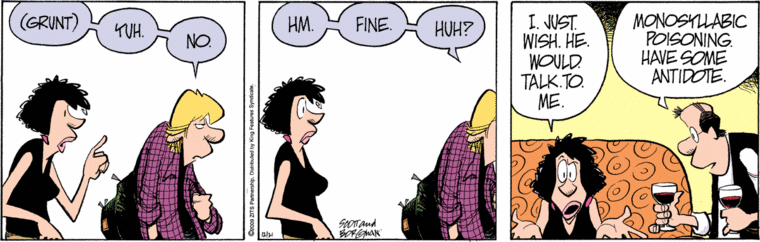 And who can listen without succumbing to the dizzying mixture of invention and description compressed into these ishes? Their pace is so unrelenting, it takes many hearings before you even realize what is being said when Sharon is asked to “be give-in-ish.” We have to work — or rather play — to decipher the playfulness.
