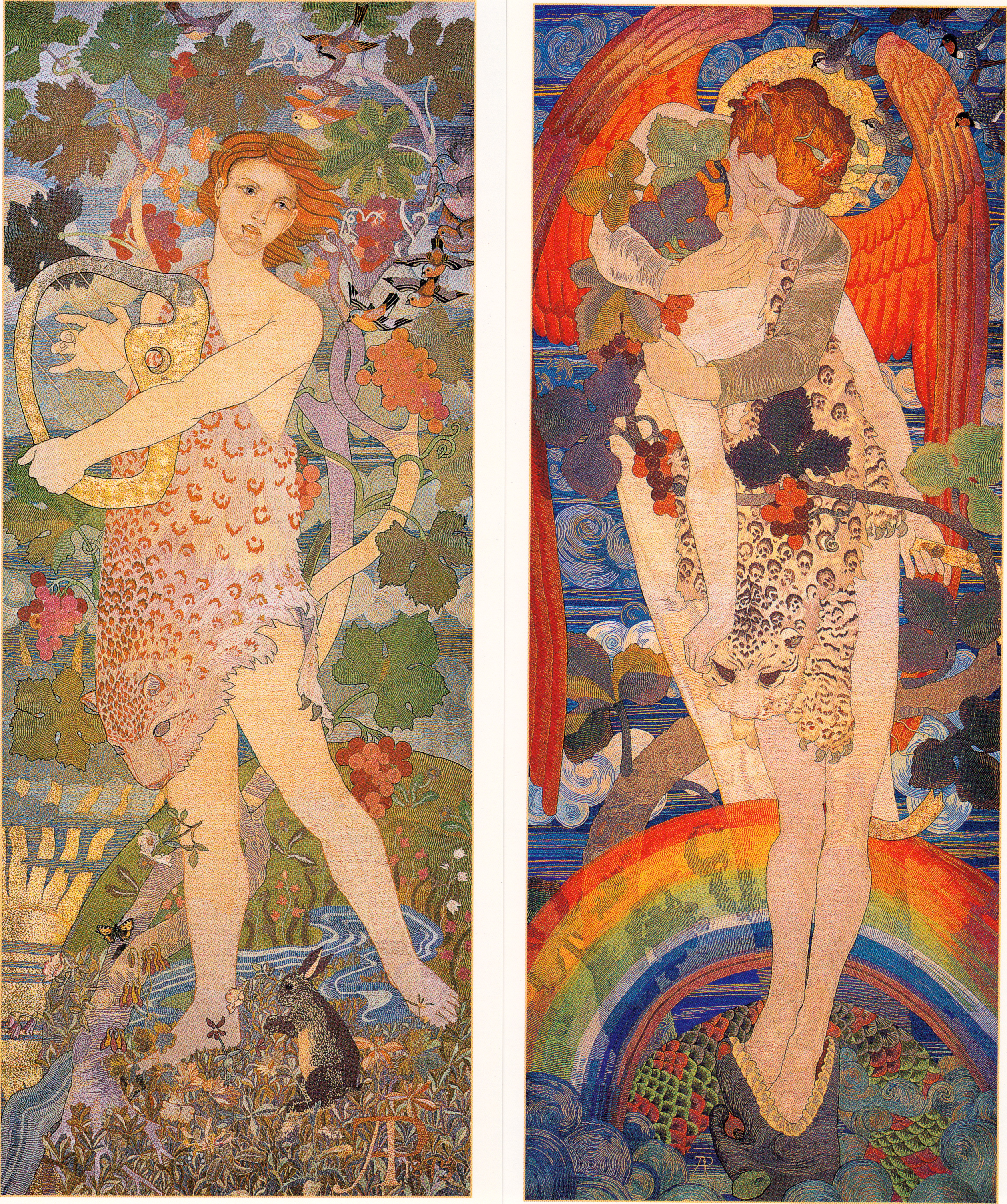 In panel 1 we have the innocent Apollo, in an Edenic land (Traquair mixes Christian and pagan imagery). In panel 4, the Apollo who has been tested (think of Christian ordeal tales) and has emerged victorious and apotheosized (with angel’s wings and halo, and a rainbow at his feet) and embraces and kisses Bacchus (himself transformed into an androgynous young man, not his usual virile and rowdy self).