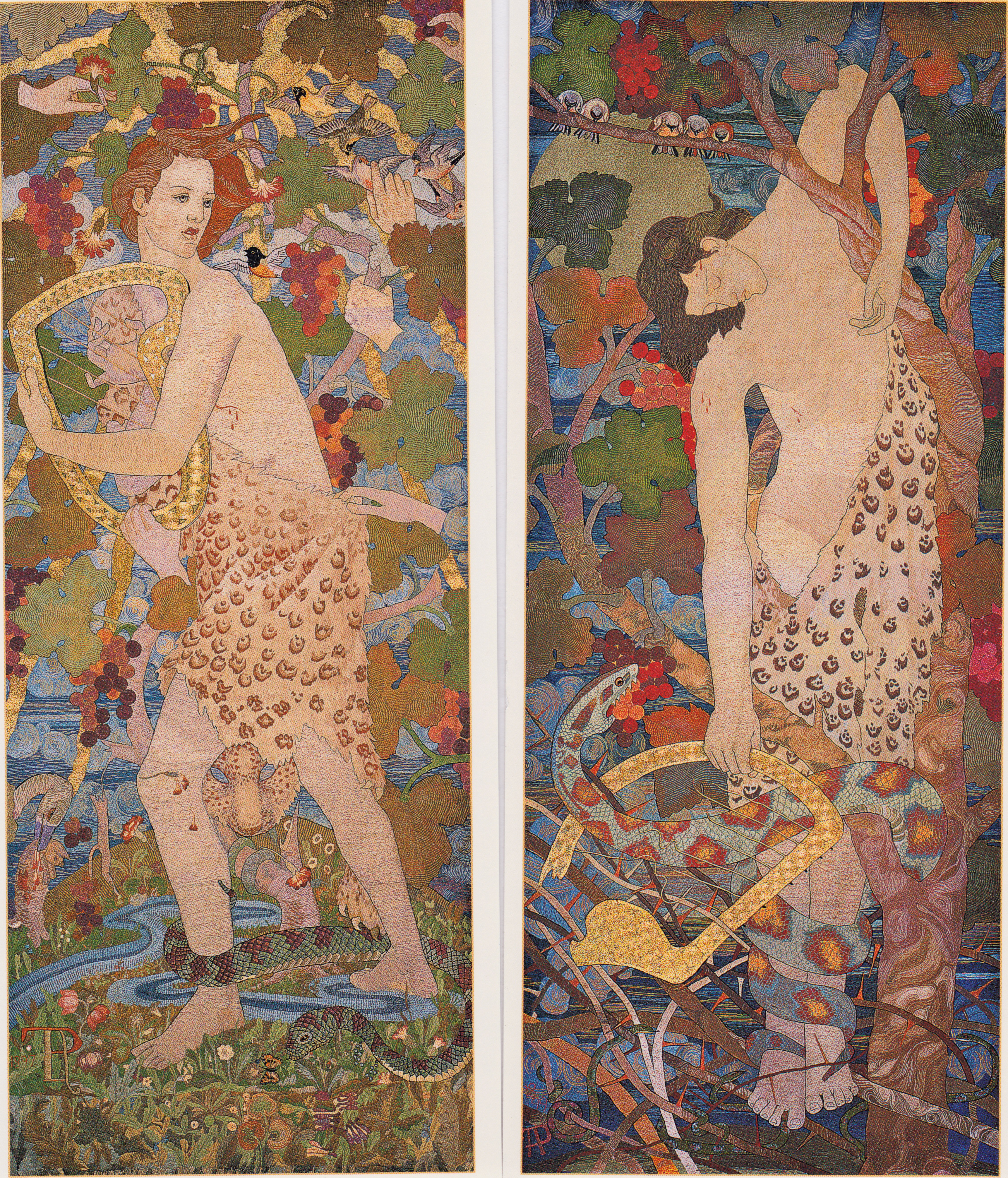 In The Progress of a Soul [created in 1895-1902], her series of four richly colored and detailed embroideries, the human soul, here an ideal young man dressed in animal skin and in harmony with the natural world around him, travels through four stages. In The Entrance, he is full of hope and enthusiasm, blissfully ignorant of life’s realities. The panels follow him through The Stress and Despair to The Victory, the last embroidery in the series. The figure was based on the character of Denys l’Auxerrois from Imaginary Portraits by English critic and writer Water Pater.