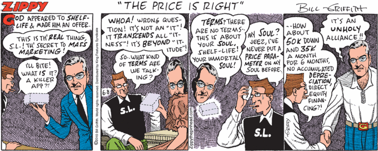 A final Commencement Weekend cartoon posting, occasioned by a comment from Kaitlyn Wierzchowski on my “Disney creepitude” posting, about the verbing (in a Zippy cartoon) of the proper name Disney via the derivational suffix -(i)fy (and then on to the nominalization Disneyfication).
