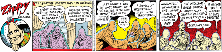 Another cartoon for the weekend, this one another Zippy in which Bill Griffith draws on references to 20th-century poetry (on other occasions, art), especially with a pop slant: