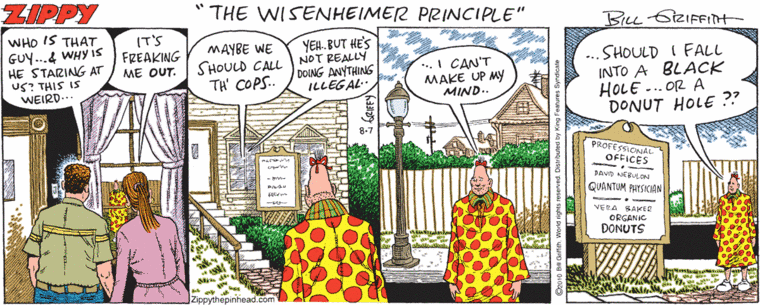 Finally, there are conventions about how occupations are listed (on signs, in directories, etc.), with the Zippy sign illustrating two of the most common schemes: job title (quantum physician) and service rendered or product offered (organic donuts).