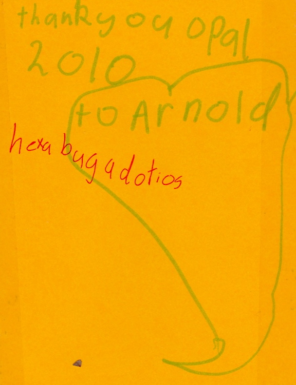 Inside was a set of photos of her taken by her mother, one for each month of 2010. HEXABUGADOTIOS is a HEXABUG (a Hexabug Habitat was my Christmas present to her) + ADOTIOS representing the last portion of EXPIALIDOCIOUS in SUPERCALIFRAGILISTICEXPIALIDOCIOUS, as it is spelled in the song title from the movie Mary Poppins. Her version of that portion makes perfect sense (right down to the TI for [ʃ]), but again there are all sorts of surprises in the correct spelling: the initial unaccented vowel, which could perfectly well have been spelled with an A (Opal’s version) rather than I; the rendering of [ʃ], which could perfectly well have been spelled TI (Opal’s version) rather than CI (note the sophistication of her choice of TI rather than SH); and the final unaccented vowel plus [s], which could perfectly well have been spelled with OS (Opal’s version, as in THERMOS) rather than OUS.