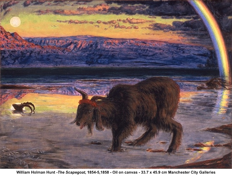 Here’s a painting of a scapegoat, the Biblical scapegoat in fact, by William Holman Hunt: