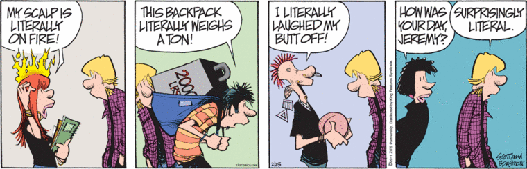Intensive literally is high on the list of language peeves, eliciting venom from all sides, on the grounds that it makes literally ambiguous — ambiguous in a way that results in confusion. Not that Jeremy was actually confused about what his friends were saying; he was just, in the manner of word ragers, pig-headedly refusing to accept the evidence (all around him) of how people are using the word (and flagrantly indulging in the Etymological Fallacy).