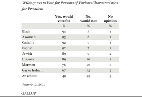 What strikes me is that the survey, or the quoted extract, fails to report on the acceptability of candidates who are white, heterosexual, or Christians of varieties other than those named. At the very least this would put the other numbers in context.