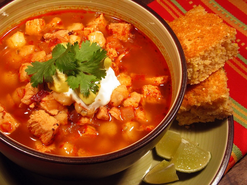 Posole satisfies the Native American theme for Thanksgiving, since it’s long been distributed from Central America, Mexico, the Southwest, through the South, and up to the Northeast. (Surely not to Alaska, since not much corn grows up there.)