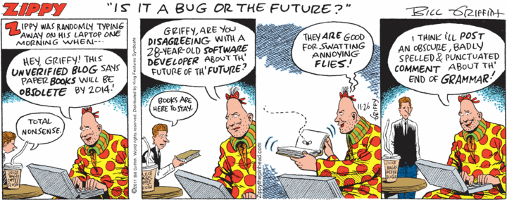Three things: the prediction of the end of the book (endless symposia, publications, etc. on the future of the book, and how it probably doesn’t have one), software developers as authorities on such matters, and the faults of language peevers (much commented on over the years on Language Log).