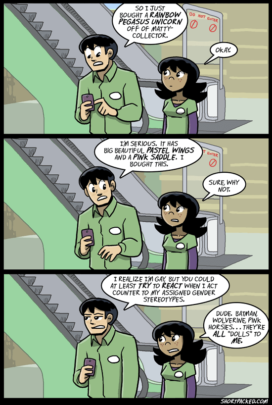 Shortpacked! is a webcomic by David Willis set in a toy store. It is part of the Blank Label Comics family. After putting an end to his successful webcomic It’s Walky!, Willis decided to turn Shortpacked!, his autobiographical comic, into a new title. The strip is based in the same universe as It’s Walky! and Roomies!, and features two side characters from the previous comic, Robin and Mike. It is more R-rated than most comic strips that appear in mainstream newspapers, using profanity and sexual innuendos not found in those newspapers. The primary inspiration behind Shortpacked was Willis’ own experiences working retail at Toys “R” Us. (link)