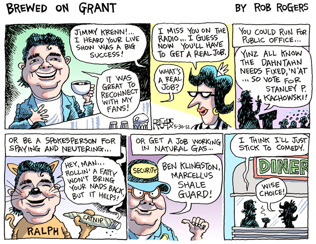 Just scanned in an editorial cartoon (by Rob Rogers of the Pittsburgh Post-Gazette) on the plight of the US Postal Service — no particular linguistic relevance — and in checking up on Rogers, I came across a recent cartoon featuring Pittsburgher English (or at least the local stereotype of it).