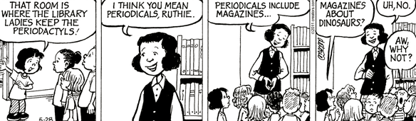 […] from Benita Bendon Campbell, two strips from the cartoon One Big Happy (information on the strip here), with little kids coping with English. Ruthie plays with alphabetical […]