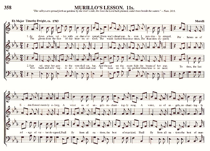 Words are credited to “Dr. Dwight” and music to “Miss M.T. Durham” (although the melody employed is a traditional fiddle tune called “Bonaparte Crossing the Rhine”). Timothy Dwight (1752-1817) was one of the “Hartford Wits,” a group of Connecticut men associated with literary work during and after the American Revolution. Dwight would go on to become president of Yale College, but he was a young man when he wrote his lyric “Columbia” in 1778, when he was a chaplain in for George Washington’s Continental Army. Dwight’s song suggests that America would be the seat of God’s kingdom and Americans its saints, and it was popular for a long time. So popular, in fact that some of the lines were incorporated into another shape-note hymn, “Murillo’s Lesson”