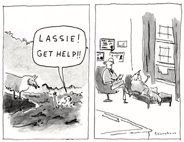A pun on get help, turning on who plays the benefactee role in help-getting: the drowning man (‘get help for me’), or Lassie (‘get help for yourself’).