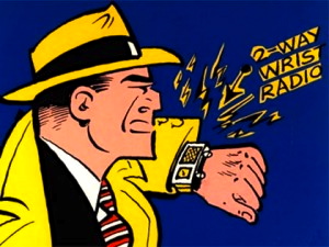 Other features of the strip: Tracy’s girlfriend, eventually wife, Tess Trueheart (Gould’s name choices were never subtle) and his adopted son “Junior” (who appears in Kupperman’s strip above), And the famous 2-Way Wrist Radio, introduced in 1946. Here’s the absurdly square-jawed detective with this piece of technology, so far ahead of its time: