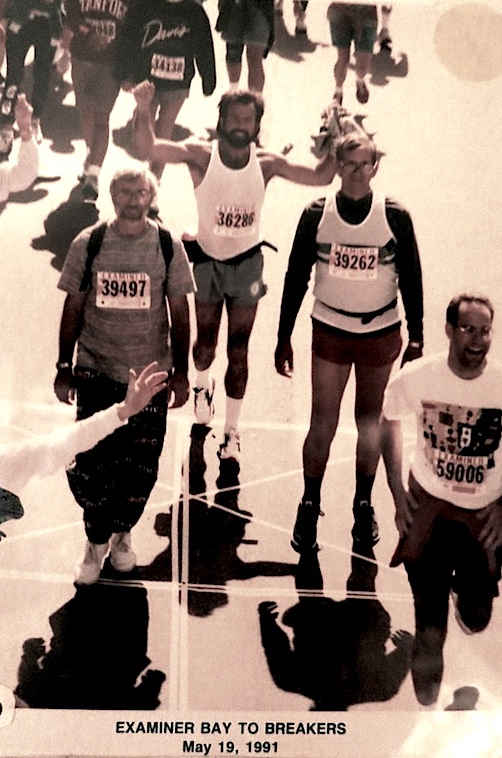 When the Bay to Breakers race in San Francisco (a race/walk from the Embarcadero to Ocean Beach, with lots and lots of costumes) came by a few months ago, I meant to post a photo of my man Jacques and me finishing the race in 1991 — an occasion that was both delightful and scary — but technical problems stood in the way. Now here’s the photo, and after it a bit of the story.