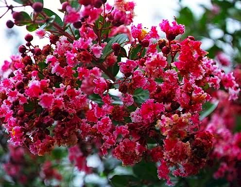Here’s a deep pink crape myrtle up close; note the crinkled flowers: