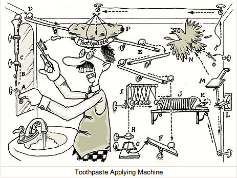 and absurdly complex machines for doing simple tasks, as here: