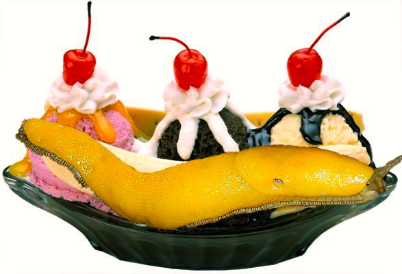 Banana slug split. A complex phrasal portmanteau, of banana slug and banana split. And the subject of much visual play. This site, for instance, has a recipe for a very simple fruit snack that sort of resembles a banana slug. But, more spectacularly, the banana slug figures in a posting on Ray William Johnson’s Daily Internet Culture site, “7 animals that would probably be delicious”: ostriches, giant sloth, micropigs, reindeer, chupacabra, banana slug, and jellyfish (some are edible, even delicious, others not so much, and who knows about the chupacabra). On the banana slug: