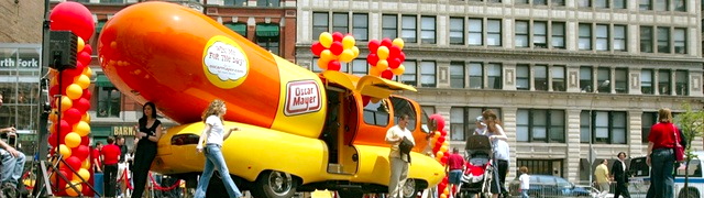 A “Wienermobile” is an automobile shaped like a hot dog on a bun that is used to promote and advertise Oscar Mayer products. It was created in 1936 by Oscar’s nephew, Carl G. Mayer, and variants are still used by Oscar Mayer today. Drivers of the Wienermobiles are known as Hotdoggers and often hand out toy whistles shaped as replicas of the Wienermobile, known as Wienerwhistles.