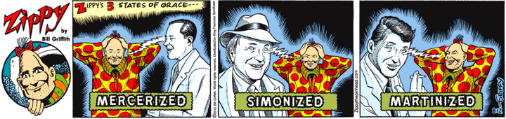 But there’s a discordance between the text and the images: The image for “martinized” is clearly Dean Martin. When I saw that, I realized that the “mercerized” is probably a reference to Johnny Mercer, though it doesn’t look much like him. The Simon is a puzzle–clearly not Paul, and of the others that Wikipedia names, Bill would appear to be the only one old enough to wear a hat like the one in the cartoon.