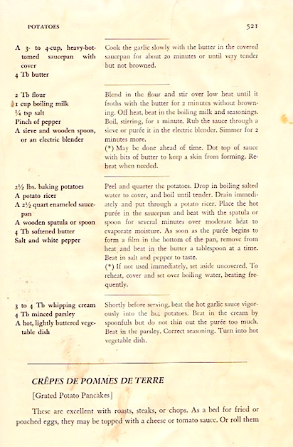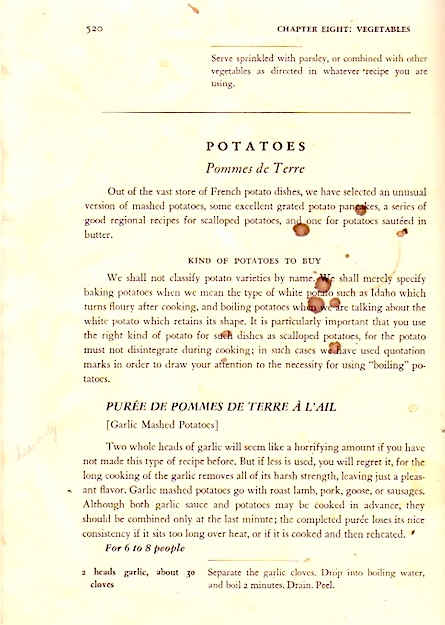 Today is Julia Child‘s 100th birthday, and I was moved to go back to my copy of Beck, Bertholle, and Child, Mastering the Art of French Cooking (1961) — a first edition, much used, food-spattered, and annotated (by Ann Daingerfield Zwicky).