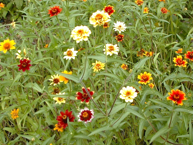 These are single-flowered zinnias, with some semidoubles, but none of the double-flowered plants that most people associate with zinnias: