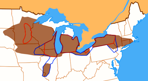 Three isoglosses identifying the NCVS. In the brown areas /ʌ/ is more retracted than /ɑ/. The blue line encloses areas in which /ɛ/ is backed. The red line encloses areas in which /æ/ is diphthongized to [eə] even before oral consonants. The areas enclosed by all three lines may be considered the “core” of the NCVS; it is most consistently present in Syracuse, Rochester, Buffalo, Detroit, and Chicago.
