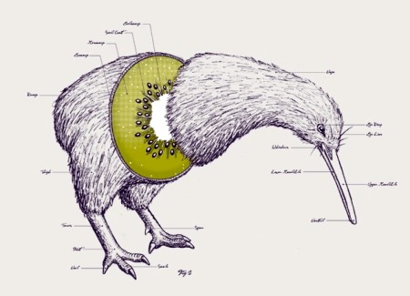 Finally, a harkening back to my posting on GMOs and chimeras (with its illustration of a sheep + cauliflower cross), this illustration of Kiwi Anatomy:
