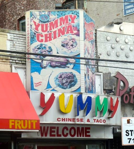 The marquee has two faces: the one you can easily see here (for Yummy China) and, to the right and at a slant, its multicultural companion (for Yummy Taco).