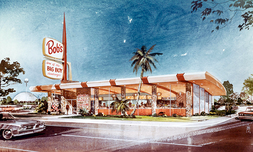 Some time ago, while I was having dinner at the bar of the Three Seasons restaurant in Palo Alto, a conversation involving customers and the staff somehow focused on the Bob’s Big Boy restaurant on S. Winchester Blvd. in San Jose. One diner and the bartender were locals and remembered the place with great affection. I was interested in it architecturally, as an example of demotic design for the world of California car culture.