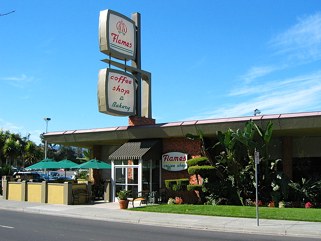 Location: 449 South Winchester Blvd., San Jose, CA Positioned in front of the Century dome theaters and down the street from the Winchester Mystery House, Bob’s Big Boy served up burgers and shakes from the mid-1960s to the late 1980s. The Bob’s building, with its rock pillars and convex roofline, was designed by the Los Angeles based architectural firm, Armet and Davis, and is a prime example of “Coffee Shop Modern.” Fortunately, when the folks at Flames took over from Bob, they did little to alter the building’s exterior. Today, Flames Coffee Shop on Winchester Blvd. looks much like its predecessor, although one thing you’ll notice is that the original sign’s characteristic spike has been shortened. Image appears courtesy Armet Davis & Newlove AIA Architects – AKA “the Godfathers of Googie.” For more classic buildings by Armet & Davis, see www.googieart.com