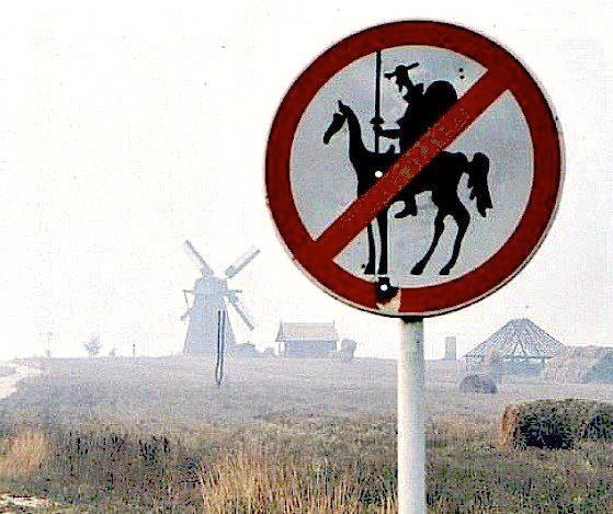 I’m not sure whether that’s wonderful or sad. In the immediate context, as a sign to mean that one should not try to interfere with the windmills themselves, it’s wonderful. But if “tilting at windmills” is taken as a metaphor for idealism, it’s sad. (It also depends on how you interpret the metaphor. I take it as meaning something apparently impossible that might result in some desired change. But I think that others interpret it as only trying something impossible, in which case tilting at windmills is a bad thing.)