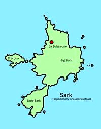 A map of Sark, showing Big Sark and Little Sark, connected by a narrow (and perilous) isthmus, and also Brecqhou, an even smaller island off Big Sark: