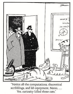 From several Facebook sources recently, this Far Side cartoon, with a twist on the proverbial Curiosity killed the cat, conveying that curiosity is dangerous: