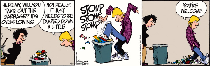Note the facial gestures, and the subversion of the mother’s request, in which Jeremy does not in fact take out the garbage, but does what strikes him as less work — though it makes a major mess.