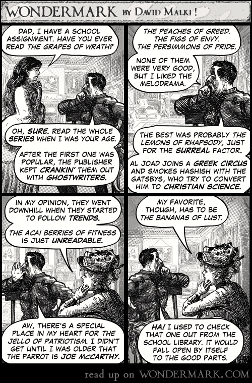 Malki isn’t the first to play on the formula provided by The Grapes of Wrath (from John Steinbeck, who got it from Julia Ward Howe, who took it from the book of Revelation). See my posting from 2010 on a New Yorker cartoon with an inventive fruiterer (selling not only the Grapes of Wrath, but also the Oranges of Indecision, the Figs of Fear (rather than, as Malki has it, of Envy), and the Kumquats of Longing. All playful variations on the original.