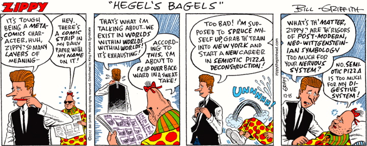 Griffy, meanwhile, has moved on to semiotic pizza — enough of a puzzle to give anyone pause — and deconstructing it. Which seems to make Zippy sick to his stomach. What a long strange trip it’s been, even without figuring out how Hegel comes into things (beyond being the vehicle for a rhyme with bagel). But wait: bagels? Are they a Hegelian synthesis of pizza and not-pizza, or what?