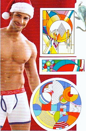 All of this can be managed by sticking to the world of tighty-whities. But the extra-support function and the sexual-advertisement function can be accentuated by the use of color contrasts, with possible other functions added in some cases. Here’s an Undergear Christmas ad with both these functions exaggerated (I’ve added Frank Lloyd Wright designs as background):