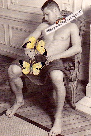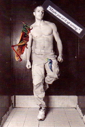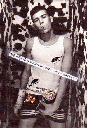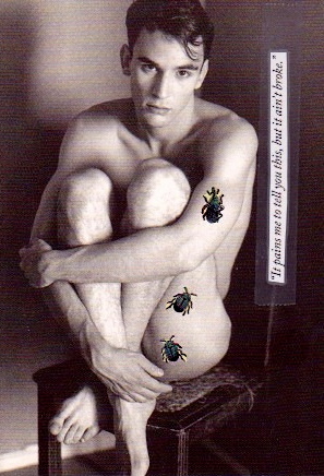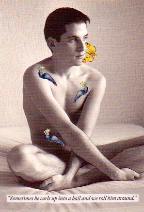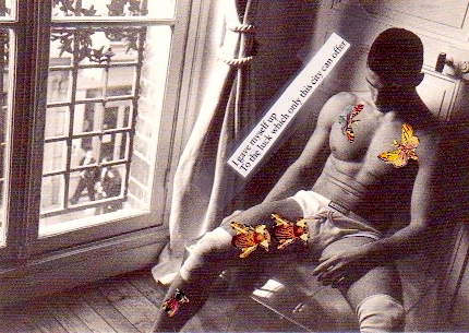Here Bessange offers a wonderful assortment of images of young Frenchmen relating to their bodies sexually — with assurance, invitation, puzzlement, unease, trepidation, inquisitiveness, whatever, each image with its own tone. The stickers introduce a sense of threat into this world: the insects are infesting the men’s bodies and beings. And the New Yorker captions make the whole relationship problematic by stating a topic, thus making the collage into what I called (here) a puzzle picture: