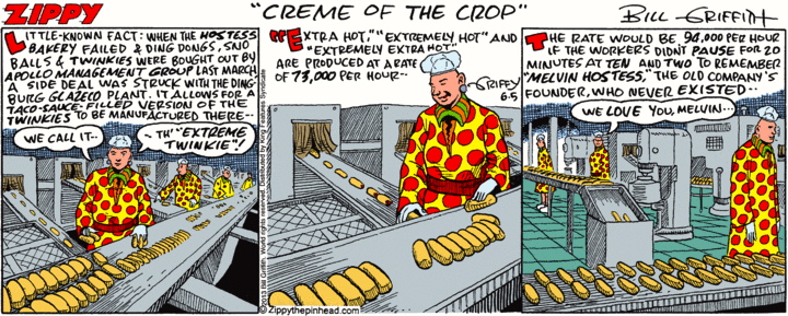 June 5, 2013Today’s Zippy combines two recurrent themes in the strip, Hostess snack foods and taco sauce: