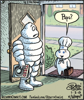 That would be the young Poppin’ Fresh, the Pillsbury Doughboy, claiming the equally white and puffy Michelin Man as his progenitor. Who could have missed that?