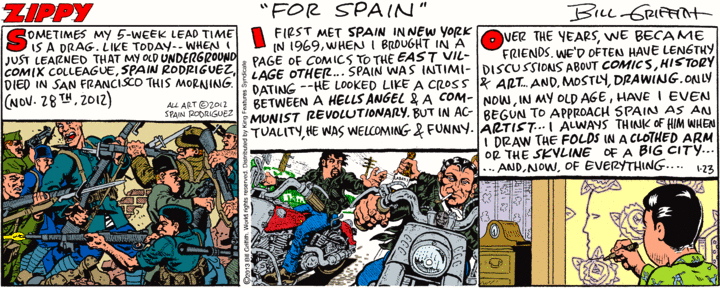 The Chron’s matter-of-fact note, “In addition to Zap Comix, he contributed work to the New York Times, Mother Jones and Hustler”, beginning with the NYT and ending with Hustler, is just wonderful.