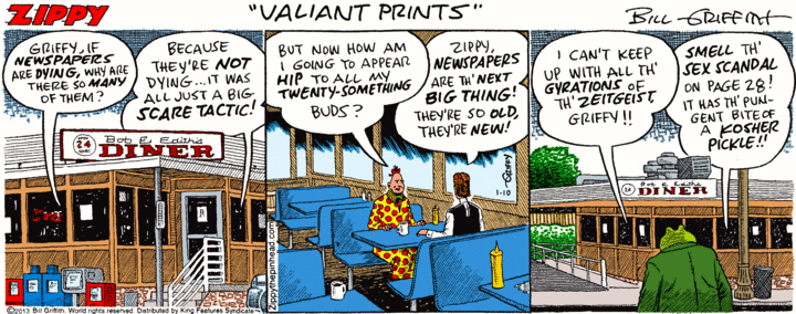 Today’s Zippy is about newspapers, their decline, and Griffy’s prediction that they’re about to come back into fashion, as a retro thing. The title — “Valiant Prints” — is a play on the name of the comic strip Prince Valiant (with the words inverted, plus the prince/prints pun). But then there’s another diner, in Bill Griffith’s endless series of them:
