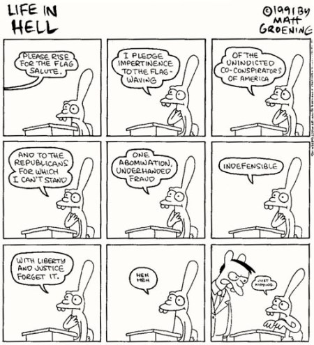 Life In Hell has come up in Language Log, where Mark Liberman posted about the “Mistakes were made” strip; and in this blog, in connection to a “Tribute to Life in Hell” collection from other cartoonists. Many LiH strips are so busy that they don’t reproduce well on screen; this is especially true of the “Forbidden Words” strips, which appeared ever year for several years. But here’s one, a burlesque of the Pledge of Allegiance, that’s more legible: