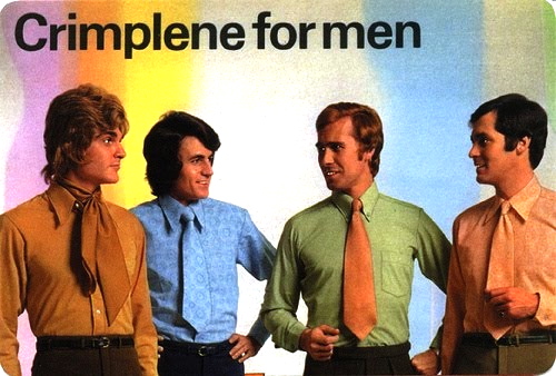 The fabric enjoyed popularity upon introduction in the 1950s in response to its convenient ‘wash-and-wear’ properties. Crimplene was often used to make the typical A-line dress of 1960s Fashion. Likewise, it was popular amongst men in British Mod Culture for use in garish button-down shirts. [See illustrations above, and note the Crimplene neckwear as well.]