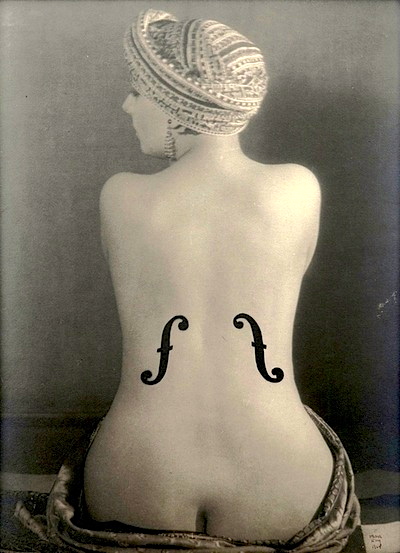 Man Ray was an admirer of the paintings of Jean-Auguste-Dominique Ingres and made a series of photographs, inspired by Ingres’s languorous nudes, of the model Kiki in a turban. Painting the f-holes of a stringed instrument onto the photographic print and then rephotographing the print, Man Ray altered what was originally a classical nude. He also added the title Le Violon d’Ingres, a French idiom that means “hobby.” [from Ingres’s fascination with the violin] The transformation of Kiki’s body into a musical instrument with the crude addition of a few brushstrokes makes this a humorous image, but her armless form is also disturbing to contemplate. The title seems to suggest that, while playing the violin was Ingres’s hobby, toying with Kiki was a pastime of Man Ray. The picture maintains a tension between objectification and appreciation of the female form.