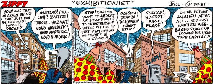 Today’s Zippy, in which cartoonist Bill Griffith indulges in his pleasure in names — in this case, names of companies and products: