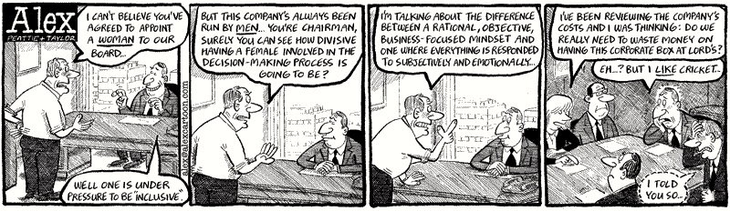 it runs weekdays in the London Telegraph and is, as far as I know, the only comic strip whose protagonist is an investment banker. The characters in this particular strip have not been seen before, except for the woman, who is Alex’s wife, Penny. This strip is typical of Alex in that it sets up an expectation (in this case, that women are the subjective and emotional sex), then subverts it in the final panel.