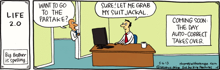 Here’s a particularly silly version of autocorrect — or possibly automatic completion software — one that replaces frequent words (party, jacket) by infrequent ones (partake, jackal), indeed infrequent words that don’t fit the context (partake is a verb, while the context calls for a noun; and suit jacket is a common collocation, while suit jackal is absurd).